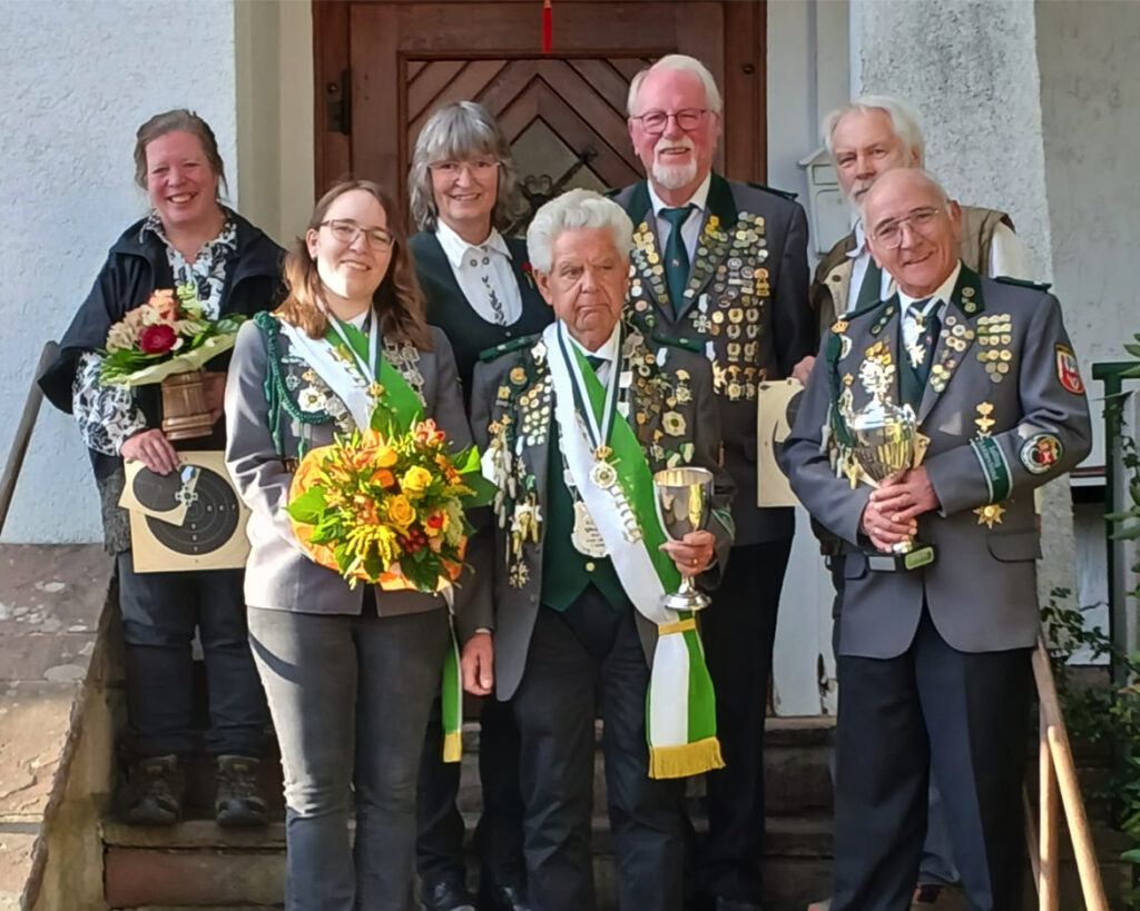 Majestäten 2025 vordere Reihe: Schützenkönigin Gesa Ludewig, Schützenkönig Dieter Spieß, Schwarzpulferkönig Ulrich Ludewighintere Reihe: 1. Prinzessin Heidi Henne, Schießsportleiterin Antje Ludewig, 1. Vorsitzender Wilhelm Pape-Lange, 1. Bestmann Ingolf Reuter